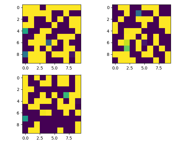 Throughout the week, I also developed some functions useful for displaying results. For example, we can follow the network through a training session. In this session, I used a feedforward neural network with an inner layer of 200 neurons and an output layer of 100 neurons. I trained it on 100,000 randomly chosen triplets from the MNIST training set. I tested the model on 10,000 randomly chosen triplets from the MNIST test set. (It had never seen images from the test set before being evaluated on them.) We can follow how the network did on one of the triplets in the training set. In this case, the image of the number 1 in the top left is the anchor, the image of the number 1 in the top right is the positive example, and the image at the bottom of the number 5 is the negative example.
