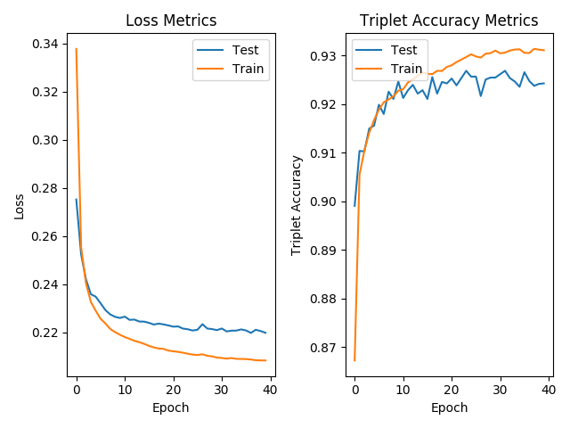 You can see that all three encodings look fairly different. We then train for 40 epochs, meaning that the network trains on all of the triplets 40 times in a row. (For those who want more technical details, I used a margin of .6 for the triplet loss, and the Adam optimizer with a learning rate of 0.0001 and batch size of 32.) I was able to graph both the triplet loss function and the accuracy. The triplet loss graphed is the average triplet loss over that epoch. The accuracy is defined as the percentage of triplets in the test set such that the encoding of the positive example is more similar to the encoding of the anchor than to the encoding of the negative example. (This is equivalent to determining the percentage of triplets in the test set with zero error, given a margin of 0 for the loss function.) Here are the graphs: